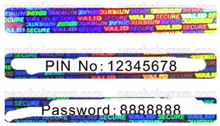 The PIN code. is corvered by hologram image. After your scratch the hologram coating by nail or coin, you will see PIN code on card, such as prepaid scratch mobile charge card or ticket. Our scratch hologram can be scratched cleanly and easily.