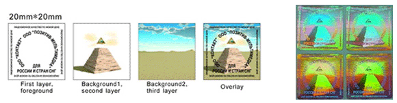 | แบบโฮโลแกรม 3 ชั้น คือ ชั้นผิวหน้า ชั้นเปลี่ยนผ่านและชั้นพื้นหลังสุด. เราออกแบบให้มี 2 ในชั้นหลังสุด, 3 สีในชั้นผิวหน้าสุด และ 1 สีในชั้นเปลี่ยนผ่านหรือชั้นกลาง รวมทั้งสิ้นเป็น 6 สี สำหรับ 3 โฮโลแกรมตามตัวอย่าง. |