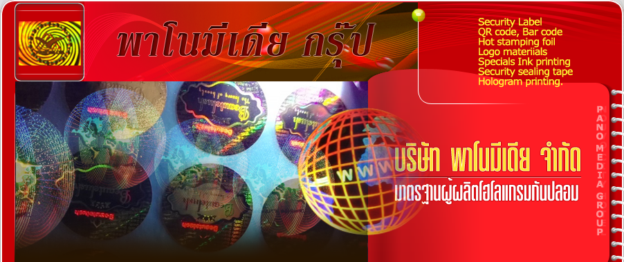สติกเกอร์โฮโลแกรม ที่พิมพ์หมึกซ่อนสีแดงไว้ เมื่อเจอแสง black light จะเรืองแสงสีแดงออกมา. |